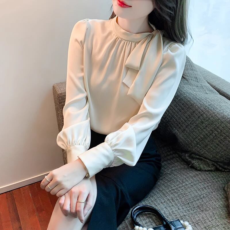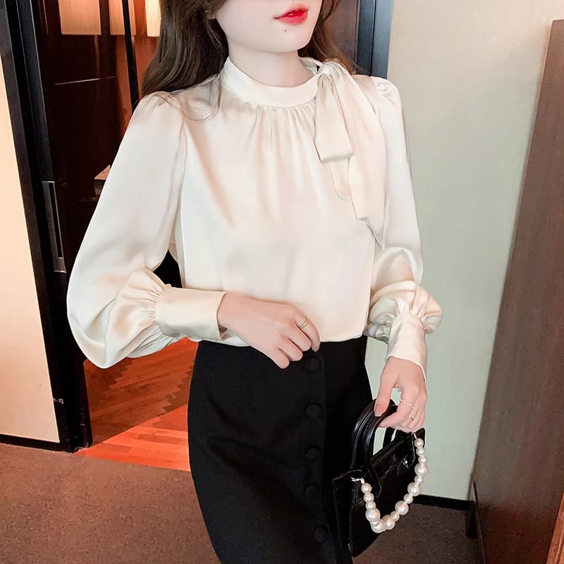 フレンチテイスト漂う、ボウタイデザインのベージュシャツ。