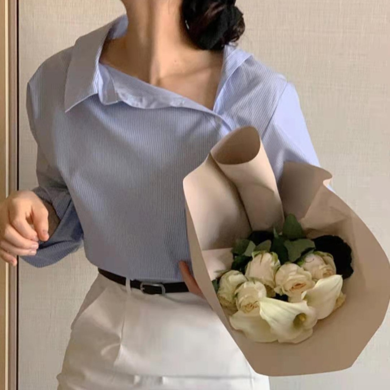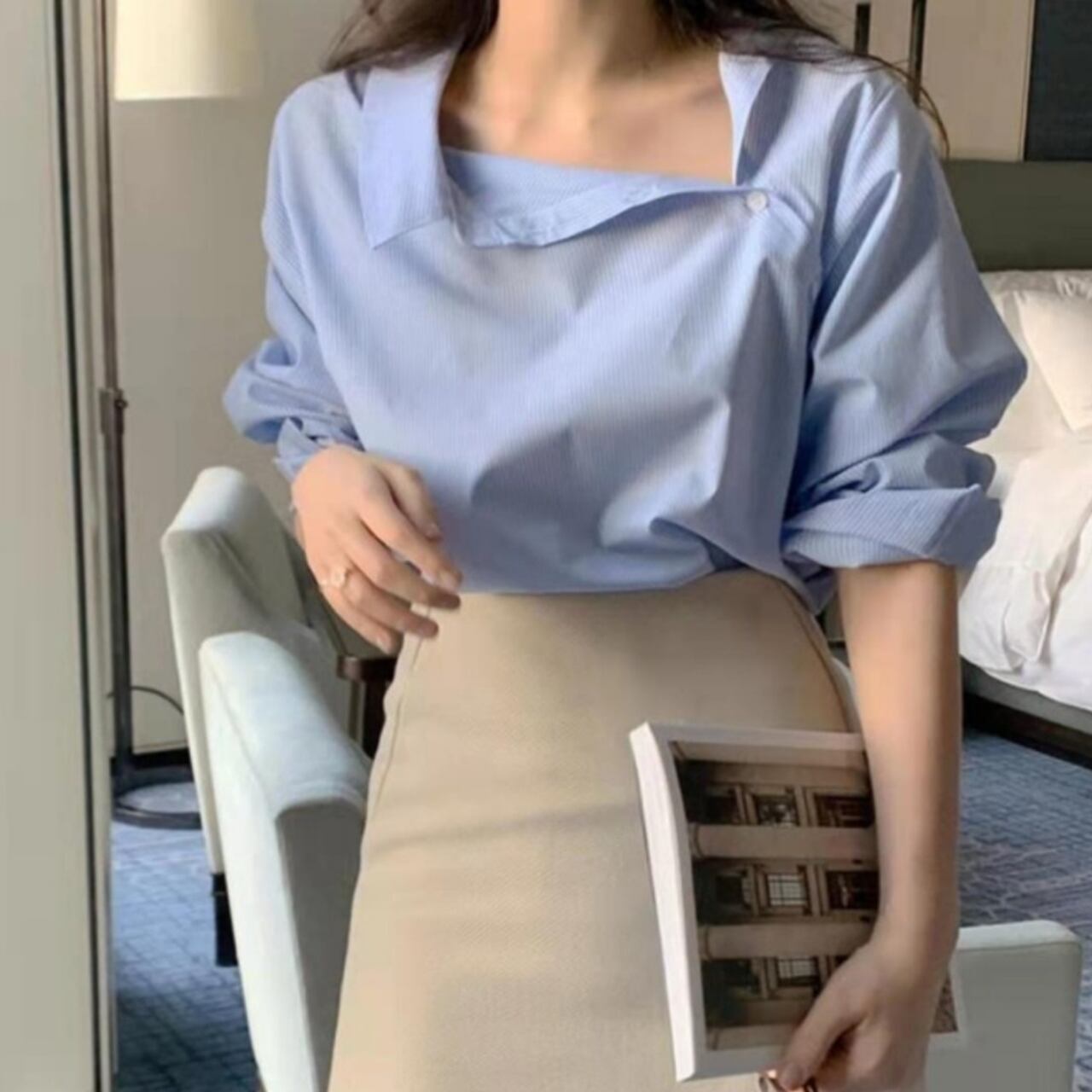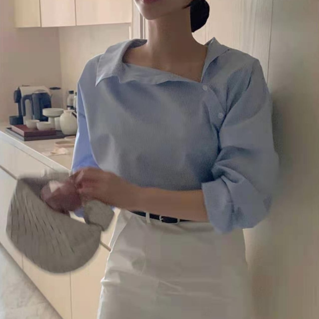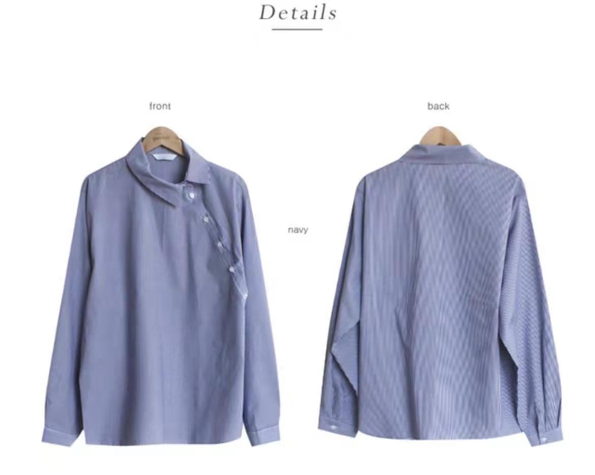 ライトブルーのストライプ柄は顔まわりを明るく見せます。