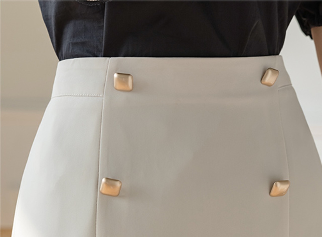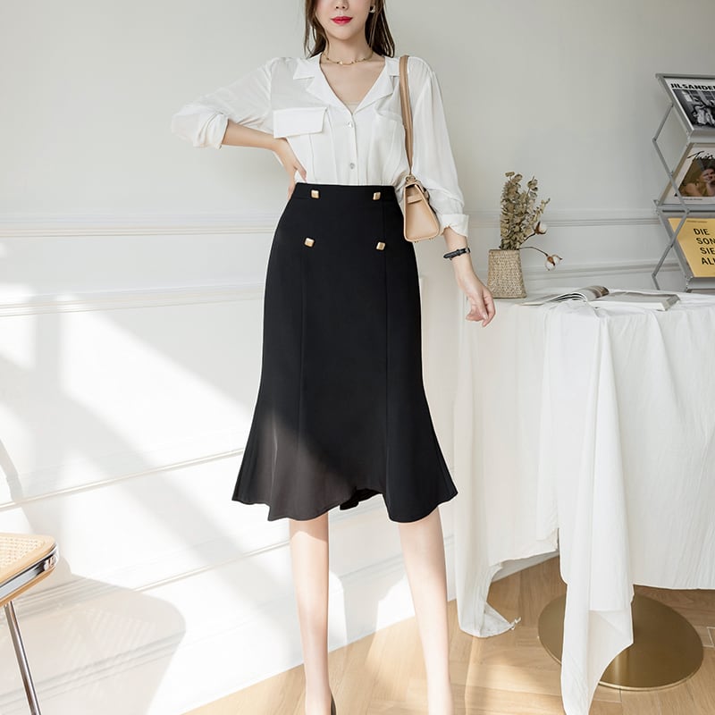 ヒップラインを美しく見せるマーメイドシルエットに、ゴールドボタンが華やかなアクセント。