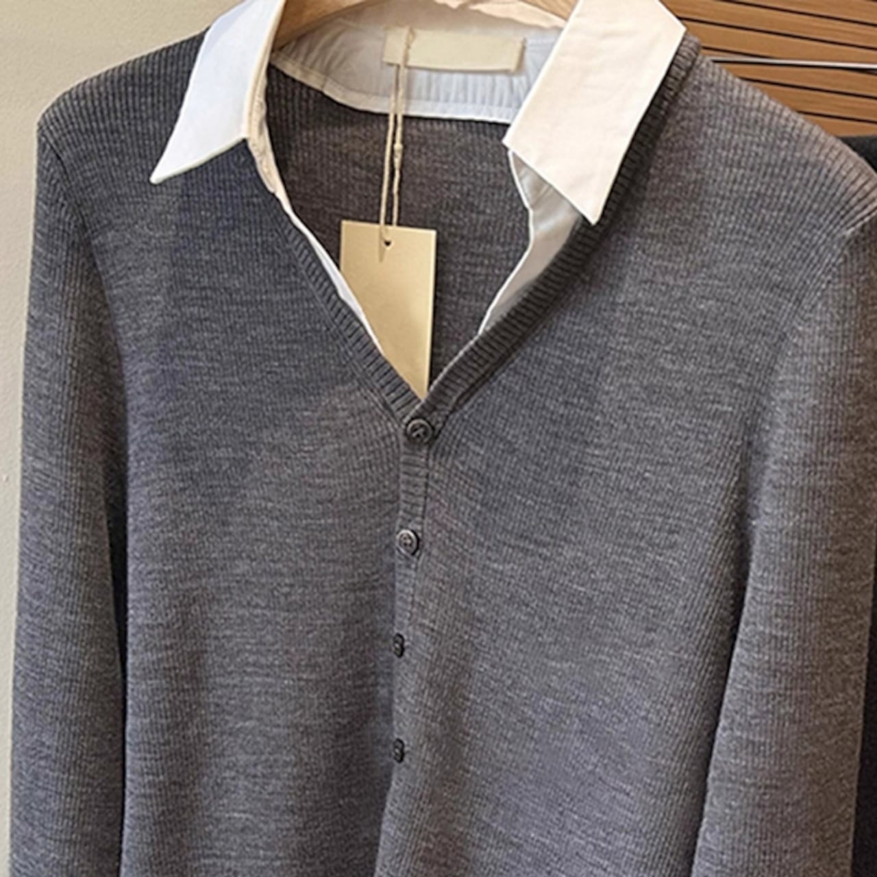 シャツを重ね着したようなフェイクレイヤードデザインが魅力のVネックトップス。