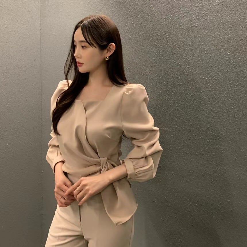 ふんわりとしたパフスリーブとスクエアネックが、上品な抜け感を演出する韓国風ブラウス。