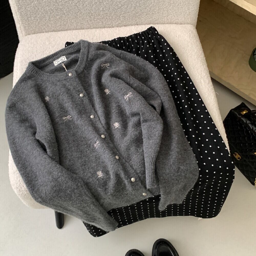 小さなリボン刺繍が愛らしく、上品な印象を与えるニットカーディガン。